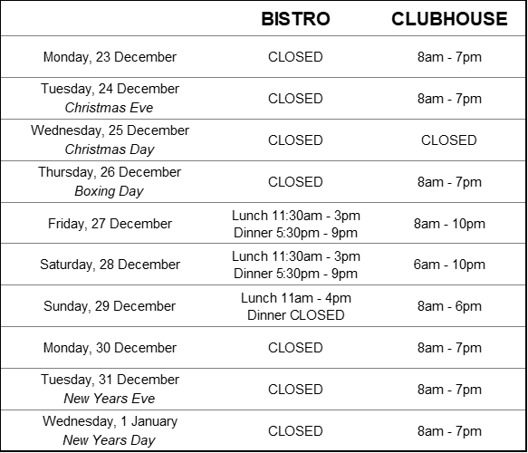 Dec 07, 2019 · Over the Christmas period, there will be changes to the Club’s trading hours. The Course and Clubhouse will be closed on Christmas day. Office The office will be closed from Monday the 24th of December 2018 to Tuesday the 1st of January 2019. Normal operating hours resume on Wednesday 2nd January 2019. The Eagle’s Bistro
